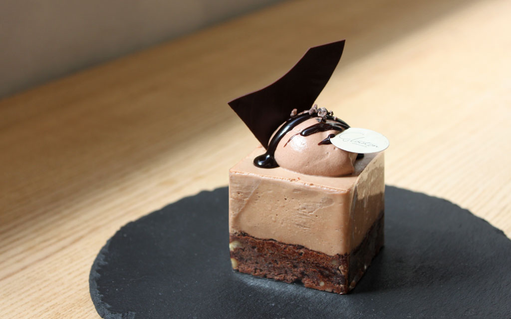 くるみ入りのチョコブラウニーに、なめらかなミルクチョコムースを重ねて。